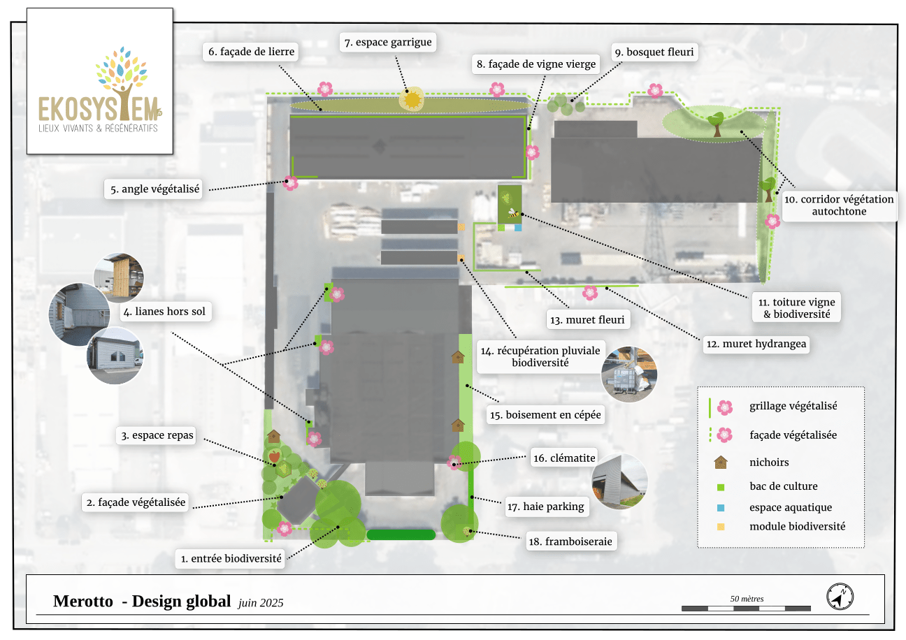 Mathieu, le dirigeant de Merotto avait découvert une réalisation d’Ekosystem dans une entreprise de la même zone et a souhaité à son tour inscrire son site dans une dynamique de régénération et de valorisation du cadre de vie. Le contexte était cependant différent : entreprise de taille moyenne, avec peu de disponibilité pour des ateliers d’intelligence collective ou des chantiers participatifs.